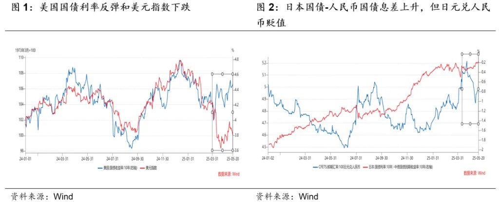 (1)贸易摩擦加剧后,美元出现了趋势性下跌。一方面是市场对贸易摩擦加剧后,美国经济的担心加剧,另外,美国的债务问题也影响到了汇率。最近穆迪宣布下调美国主权信用评级。因此,4月份以来,呈现出美债利率反弹和美元指数下跌的局面。背后的逻辑就是市场对美元债务的担心的加剧。如果美元汇率下跌趋势形成,或导致人民币被动升值。